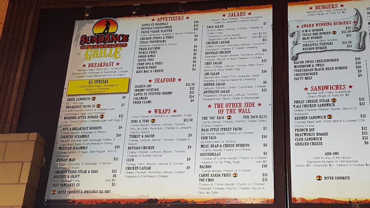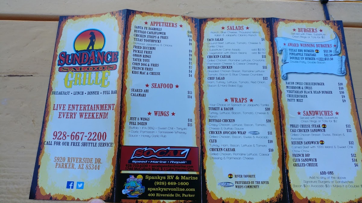 Welcome to Sundance Saloon, a vibrant culinary gem located on the scenic Parker Strip at 5920 Riverside Dr, Parker, AZ. The menu invites you to indulge in a diverse range of dishes, ensuring there's something for everyone.